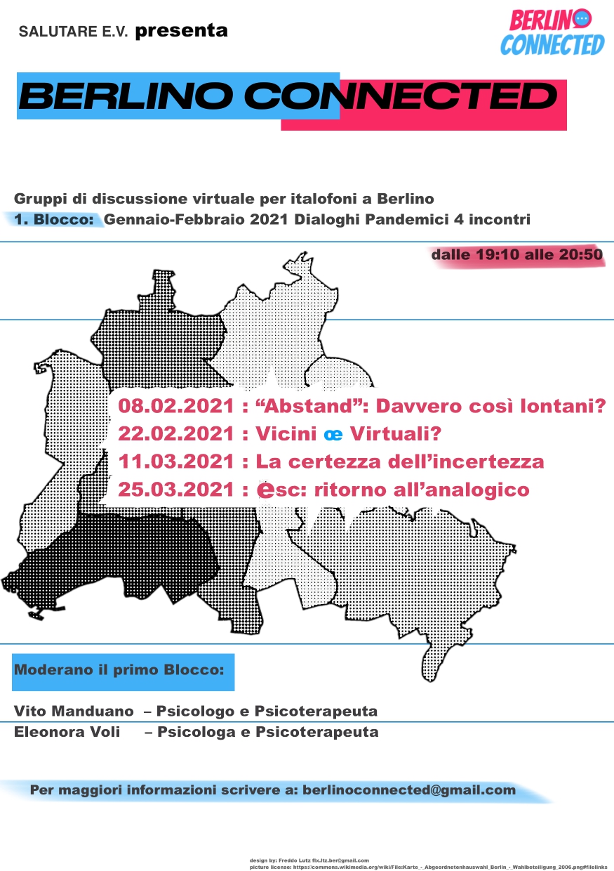 Il progetto Berlino Connected intende offrire, attraverso lo svolgimento di gruppi di discussione online, uno spazio di dialogo, condivisione, sostegno reciproco e informazione alla popolazione italiana sul territorio di Berlino e Brandeburgo relativamente a diverse tematiche.