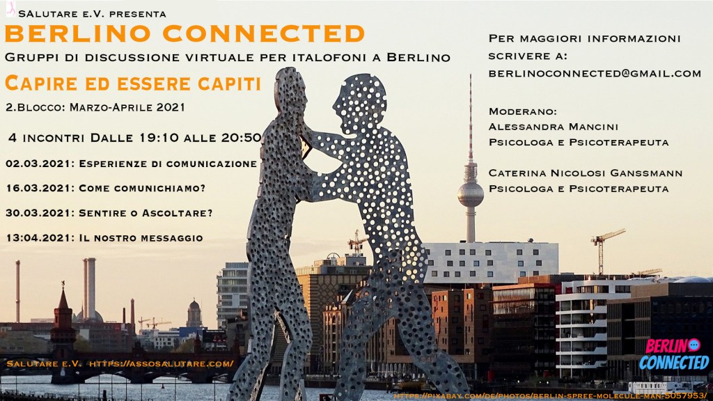 Il progetto Berlino Connected intende offrire, attraverso lo svolgimento di gruppi di discussione online, uno spazio di dialogo, condivisione, sostegno reciproco e informazione alla popolazione italiana sul territorio di Berlino e Brandeburgo relativamente a diverse tematiche.