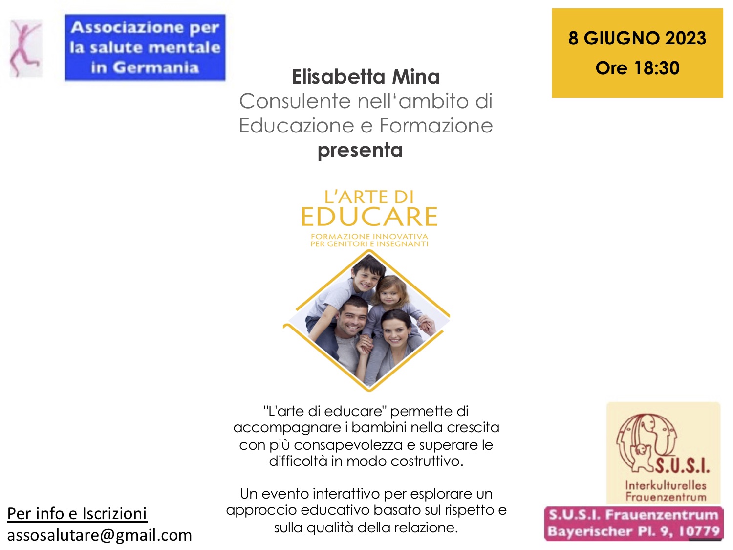 Si tratta di un incontro di persona e interattivo con Elisabetta Mina, educatrice a Berlino, specializzata nel lavoro con genitori, insegnanti e bambini.